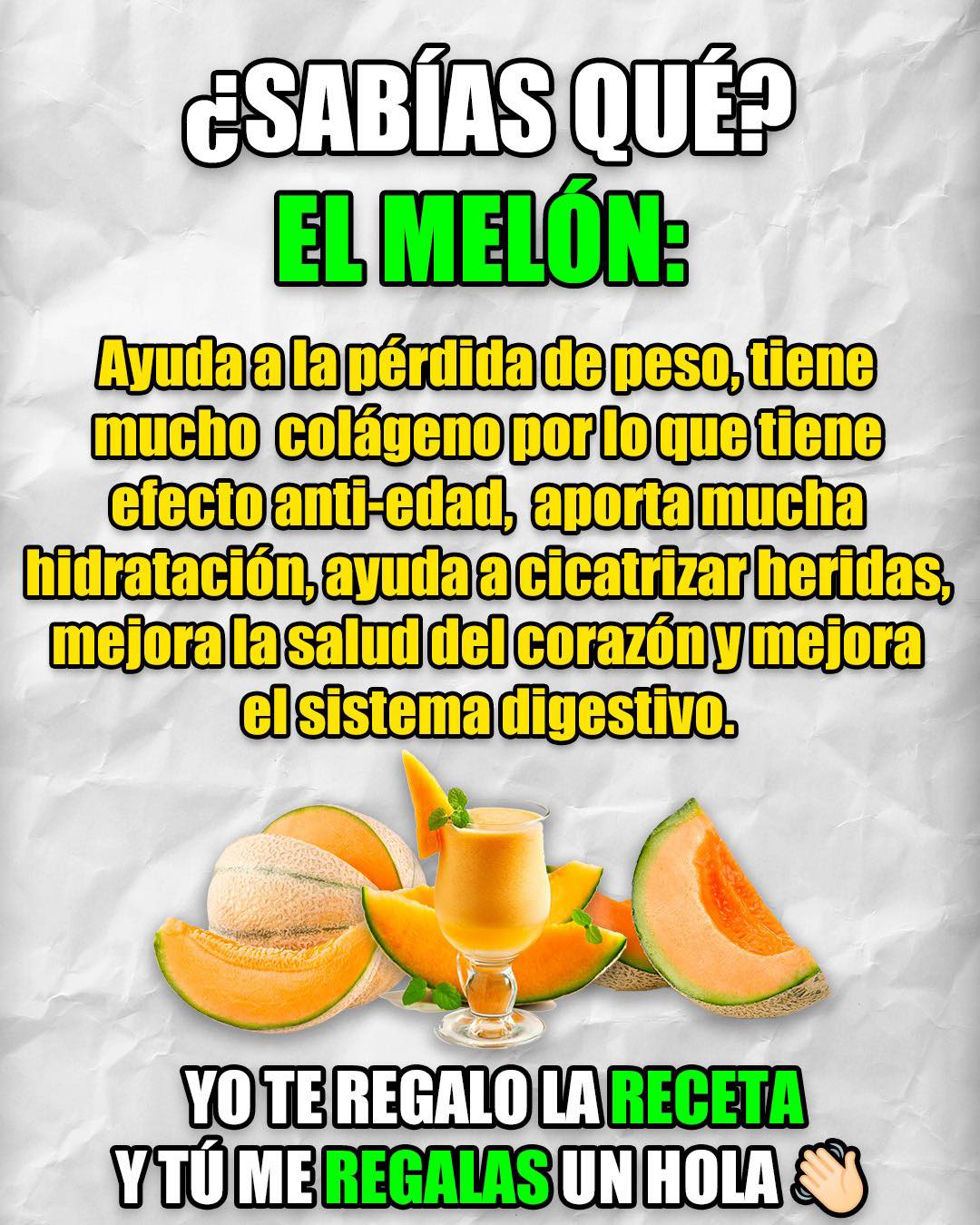 Conclusión: El melón no solo es delicioso, sino que también es un aliado para tu salud. Consumido con moderación, puede ayudarte a mantenerte hidratado, cuidar tu piel, proteger tu corazón y sentirte lleno de energía.